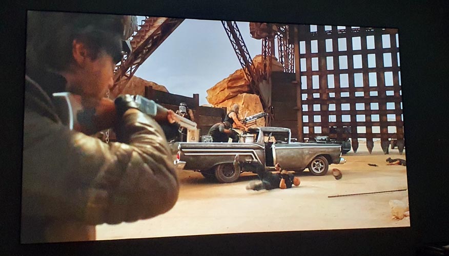 Oke, sekarang yuk mari putar Mad Max: Fury Road . Pilih ini, karena menurut pengalaman, ini adalah salah satu yang paling seru untuk melihat bagaimana proyektor menangani warna-warna gurun yang kontras, repro aneka logam logam, baik dari kendaraan, tameng, bangunan dna lain lain. Film ini bolehlah kita pakai sebagai reference demo movie untuk proyektor karena penuh warna ekstrem: gurun oranye, langit biru keras, api, serta kendaraan penuh logam dan karat.