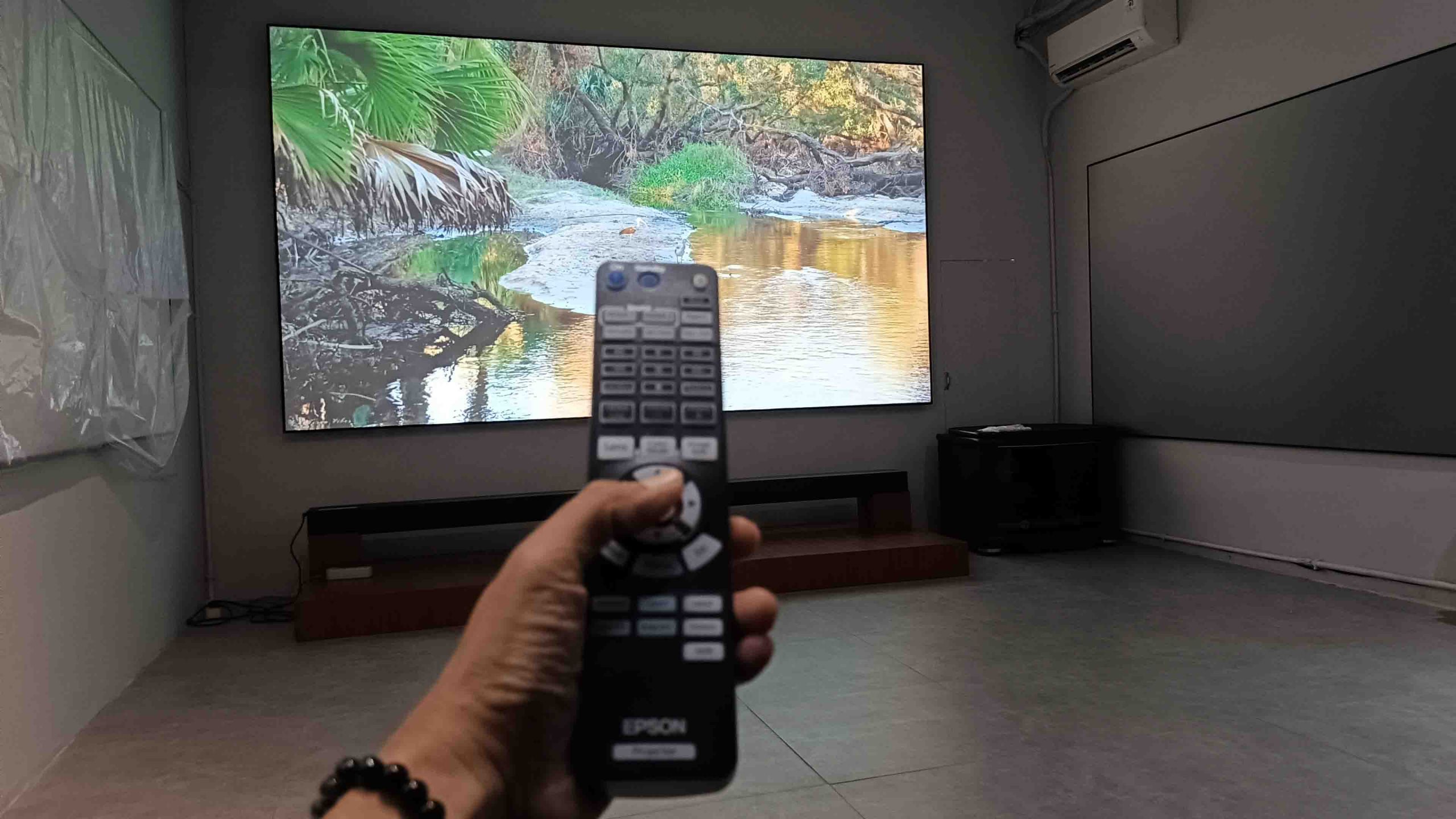 Di ruangan, kami coba nyalakan dua lampu di depan layar, dan ternyata gambar masih terlihat cukup kuat. Memang tetap lebih ideal jika ruangan gelap, tetapi pengalaman menonton tidak langsung rusak hanya karena ada sedikit cahaya. Ingat hal ini, jadi ingat lagi akan bagaimana menonton dengan proyektor dan layar, lebih sehat dibandingkan menonton dengan TV, khususnya dari sisi pancaran sinar. Saat menonton ini, cahaya yang kami lihat adalah pantulan dari layar, bukan cahaya langsung seperti TV. Akibatnya, layar yang sangat besar tetap terasa santai di mata. Selain itu, secara visual ruangan terasa lebih bersih. Proyektor bisa dipasang di plafon, dan layar hanya muncul saat ingin menonton. Ketika dimatikan, ruangan kembali terlihat seperti biasa.