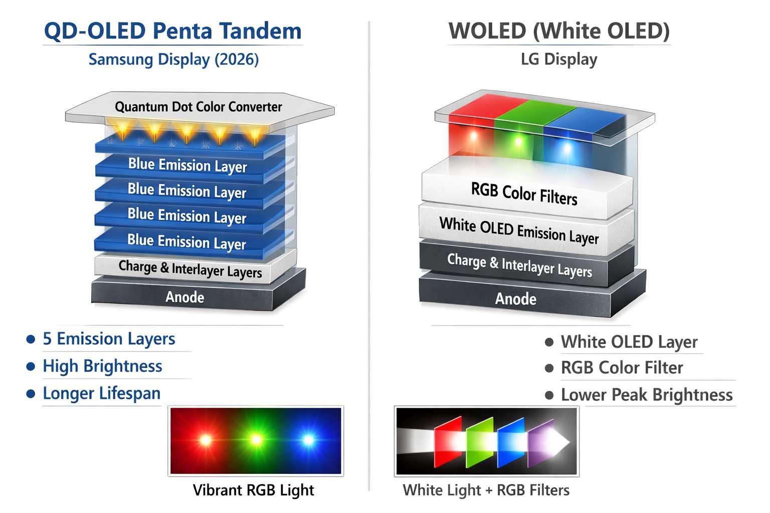 Perbandingan RGB Tandem OLED yang baru (kiri) dengan yang lama(kanan). Samsung kini menambah jumlah lapisan emisi dan memanfaatkan quantum dots untuk dorong brightness dan efisiensi, sementara LG mengandalkan WOLED matang dengan filter warna yang menonjolkan kontras dan stabilitas warna
